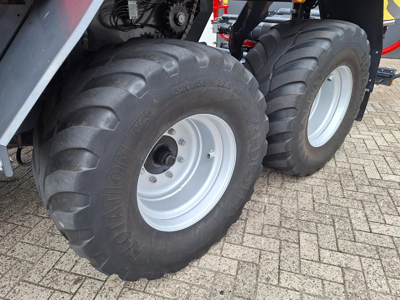 -Hydraulisch verstelbare knikdissel met geintegreerde dansonderdrukker -Lage dissel met kogelkoppeling K80 -Banden: 520/55 R 22,5 Flotation Trac -Luchtdruk beremming -Expert 75 ISOBUS bedieningskast -Load-Sensing uitvoering -Messenbalk en bodem hydraulisch opklapbaar -Automatische kettingsmering -Automatische vetsmering -Camera richting wikkeltafel